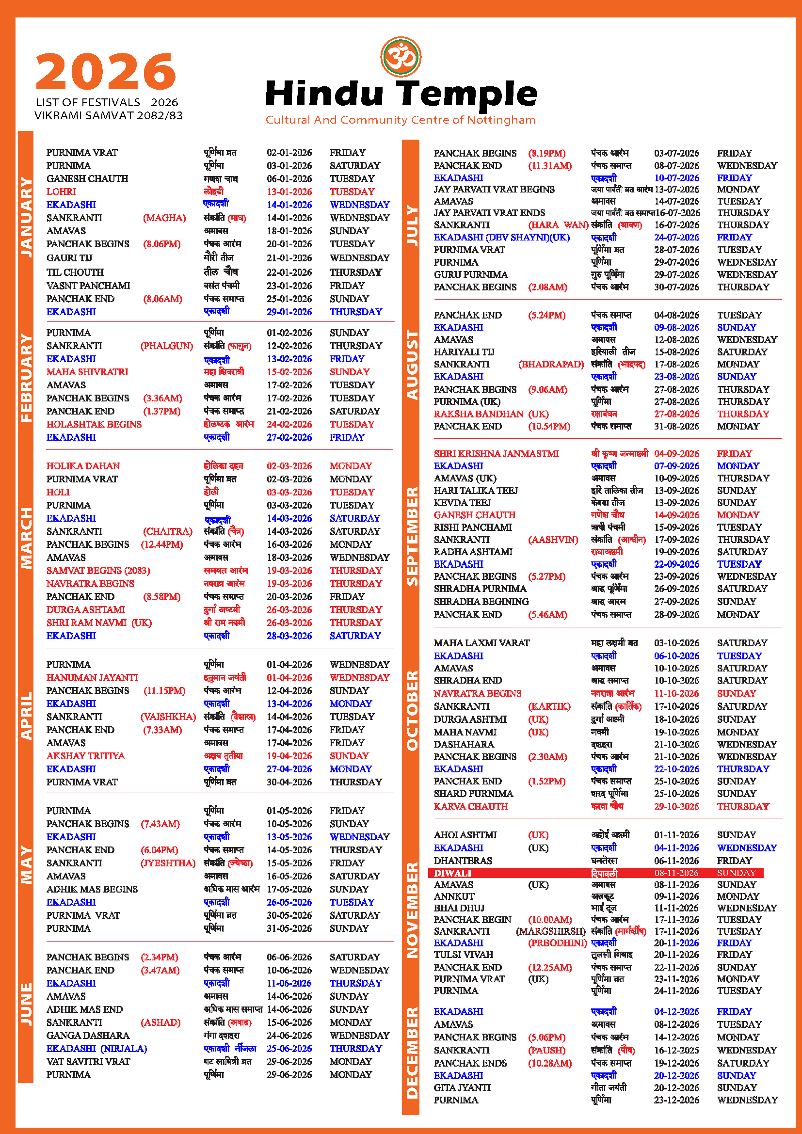 2026 - Hindu Temple Nottingham Calendar