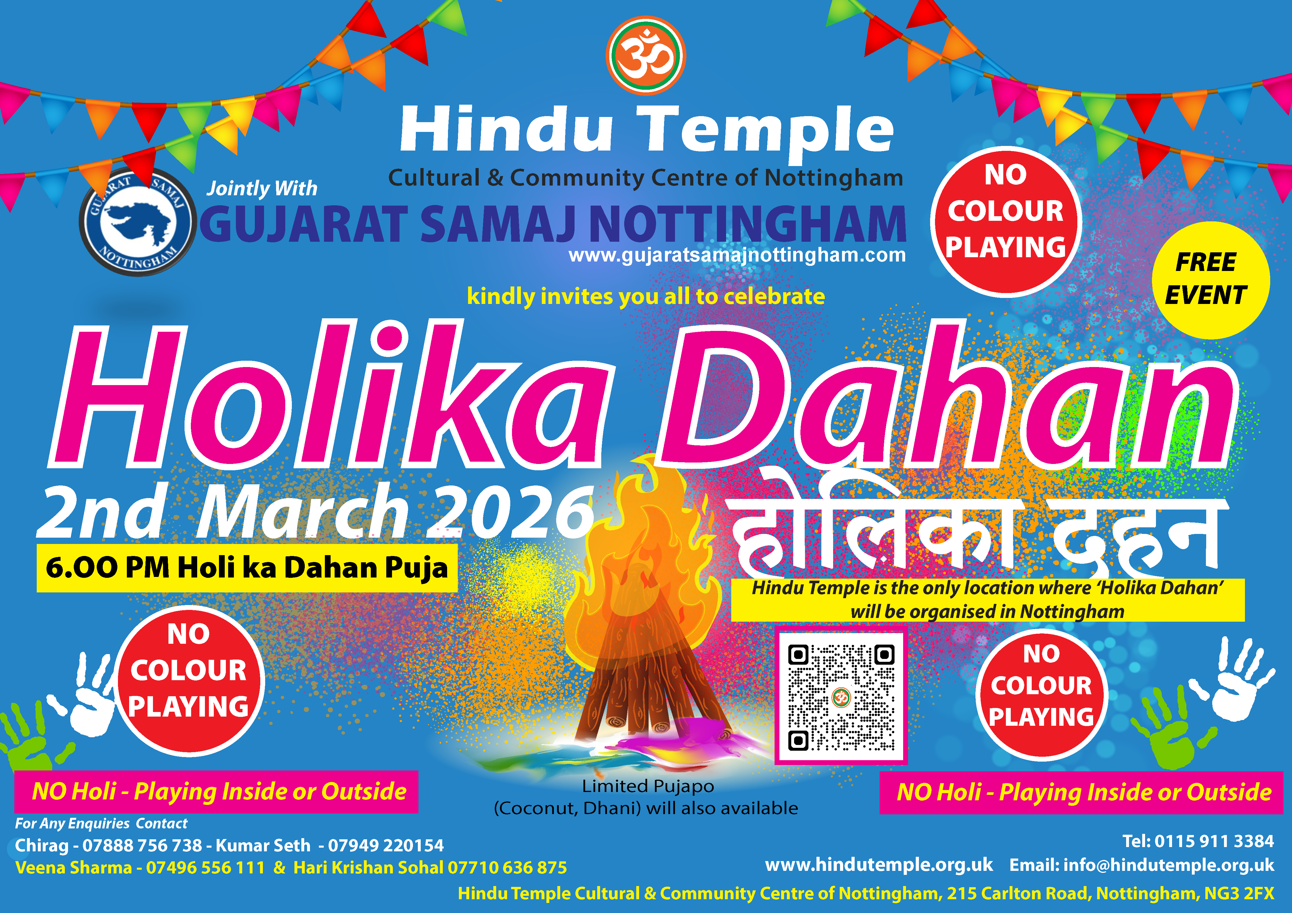 NO COLOURS WILL BE PLAYED AT THE TEMPLE THIS YEAR DUE TO ONGOING WORKS. HOWEVER, THE PUJA AND HOLIKA DAHAN CEREMONY WILL CONTINUE AS PLANNED.